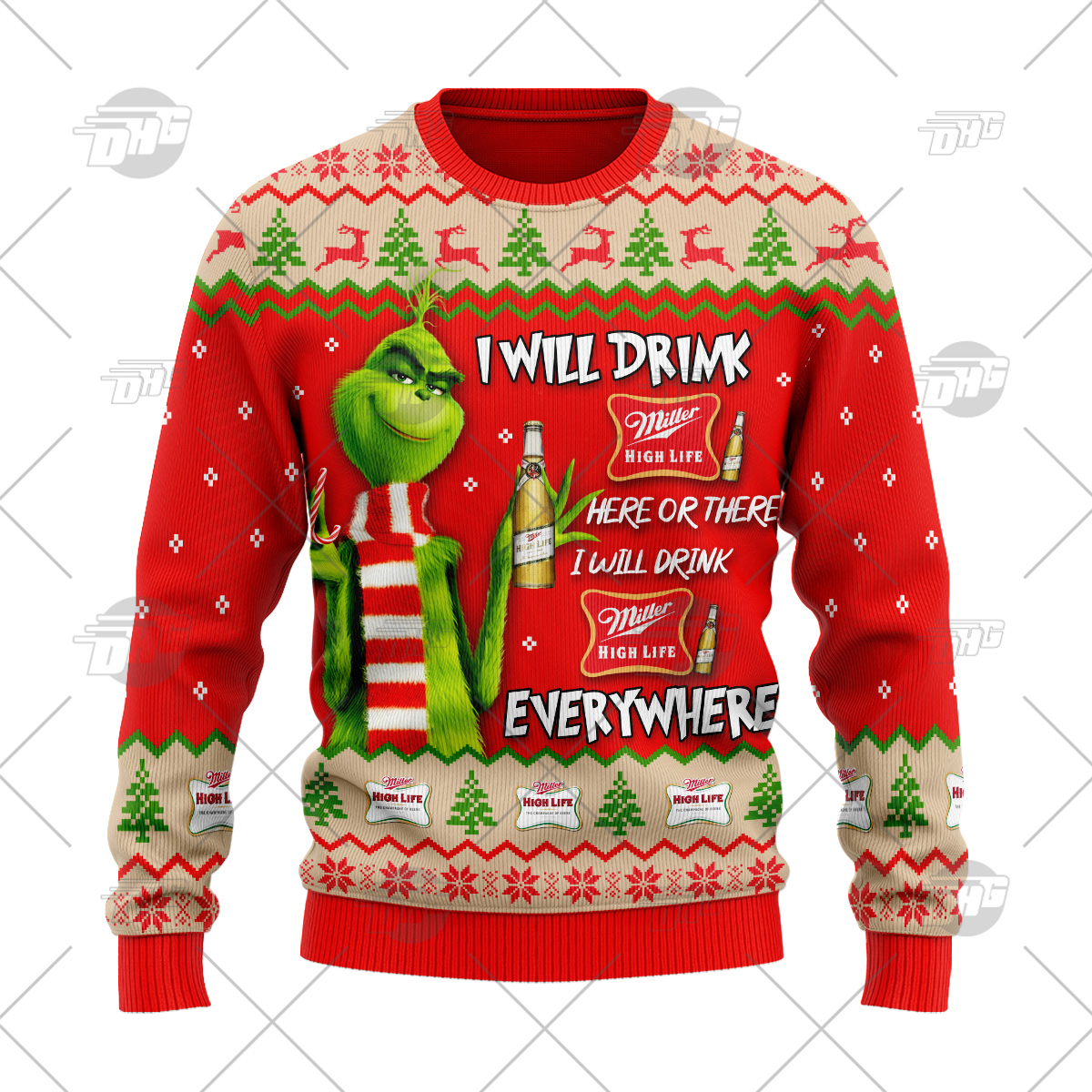 Grinch I Will Drink Here Or There I Will Drink Everywhere Miller High Life Beer Ugly Christmas Holiday Sweater